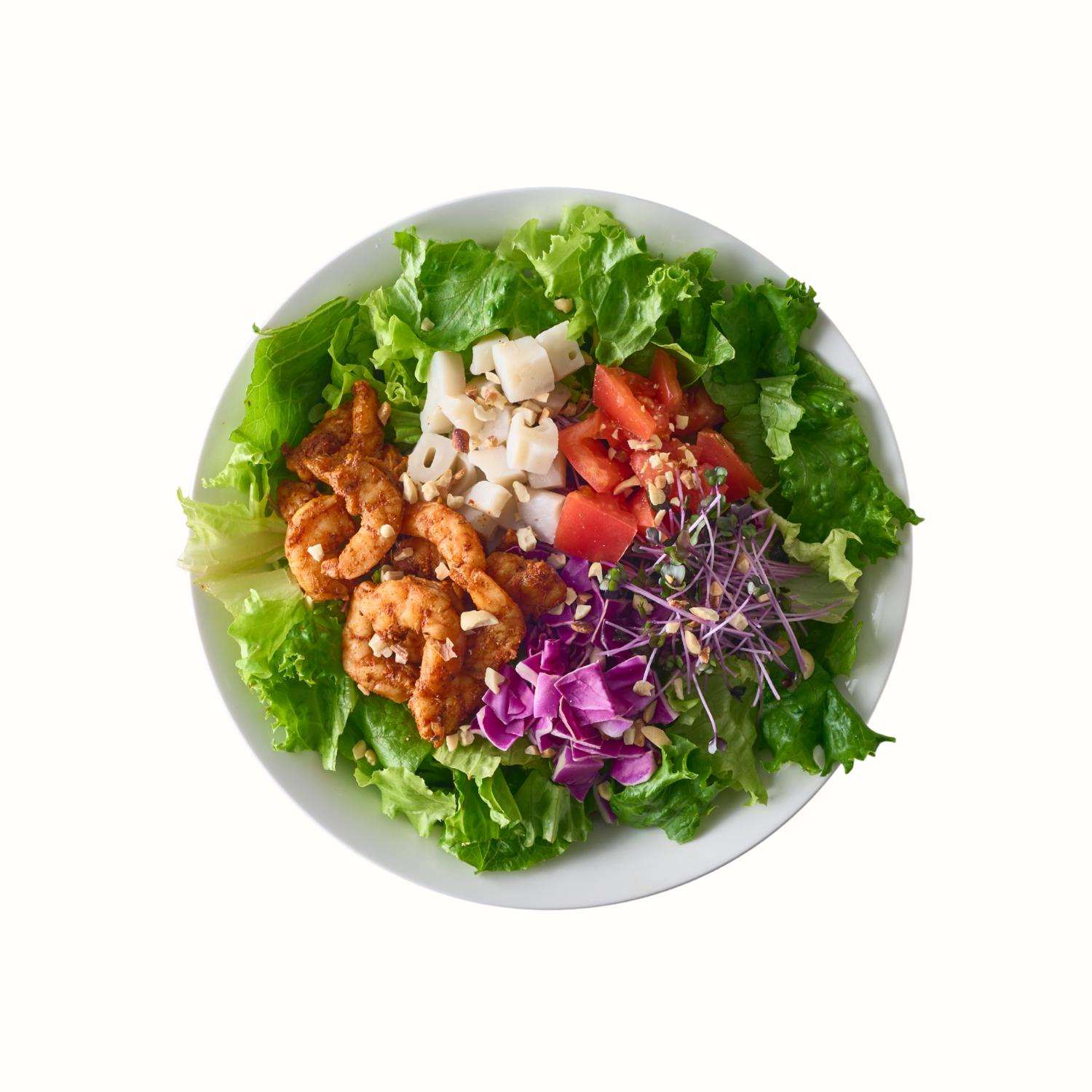 ロメインレタス、オークレタス緑、リーフレタス、ベビーリーフ、レッドキャベツスプラウト トマト、赤キャベツ、レンコン、バナメイエビスパイシーグリル、トッピングナッツ